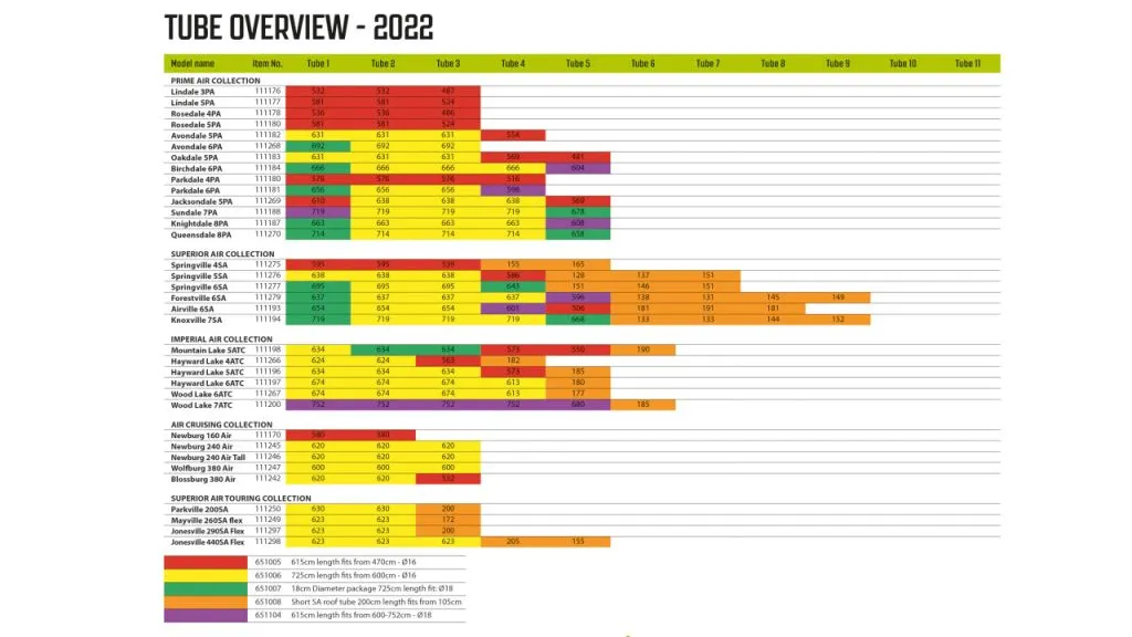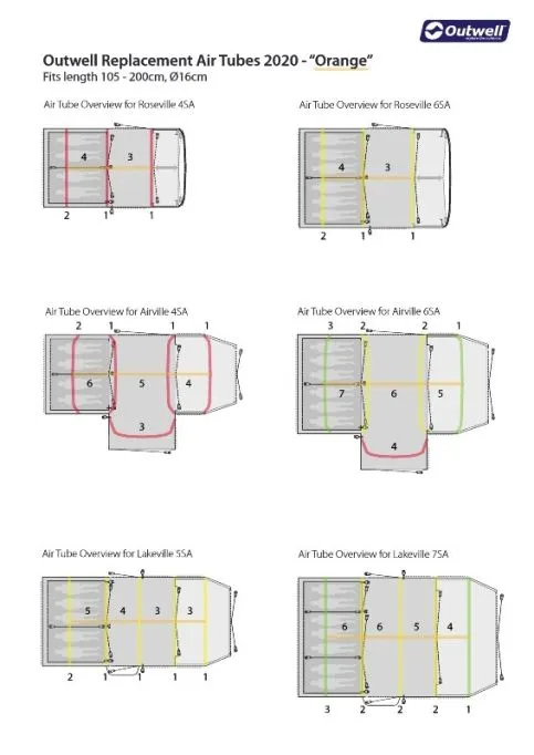 Despite air tent beams being very reliable on the whole, you may occasionally need to replace a beam. For this reason, Outwell has made 4 different-sized replacement beams available. This beam will fit these models -Fits Lakeville 7SA, Roseville 6SA, Airville 6SA, Lakeville 5SA, Roseville 4SA, and Airville 4SA Look at the image here to check which part of the tent which coloured beam will fit.