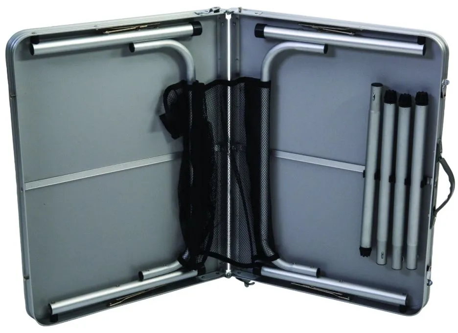 A premium aluminium quality folding table. It features an aluminium frame that is height adjustable between two different heights swell as adjusters on the bottom of the feet for the uneven ground to ensure that the table will always be as flat as possible.
